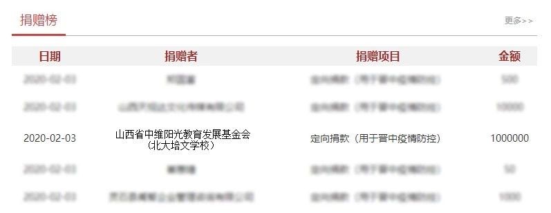 2020年2月3日,山西省中維陽光教育發(fā)展基金會(huì)攜北大培文學(xué)校共同捐資人民幣100萬元,用于疫情防控工作。