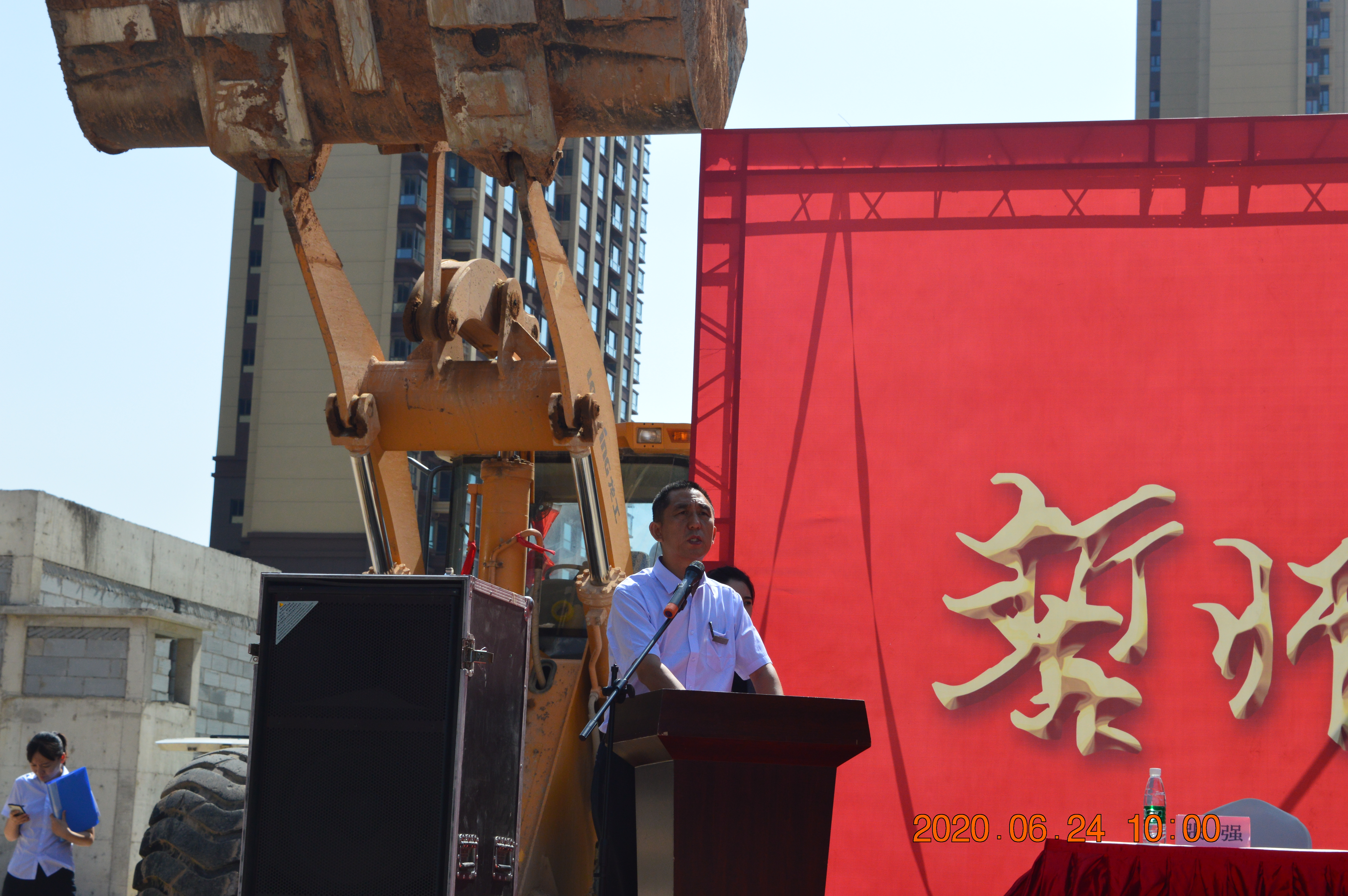 觀摩結(jié)束,全體人員行至主會(huì)場,只見主席臺(tái)上“誓師戰(zhàn)百日、交房倒計(jì)時(shí)”鎏金大字磅礴而現(xiàn),兩側(cè)裝載機(jī)猶如雄獅俯臥、旌旗招展颯颯威武!全體人員就位,工程百日會(huì)戰(zhàn)誓師大會(huì)正式拉開帷幕!